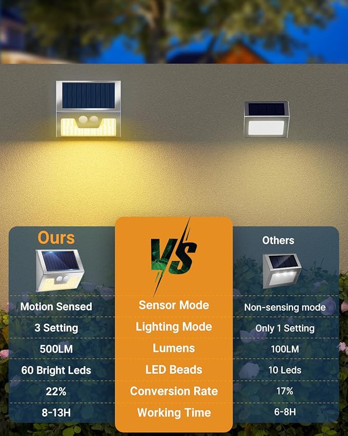 - Faster Charging-Longer Illumination:This solar motion activated light boasts a supercharged solar panel with a 20-22% conversion rate, meaning it charges up quicker during the day. That translates to longer illumination at night, keeping your outdoor space brightly lit for enhanced safety and security