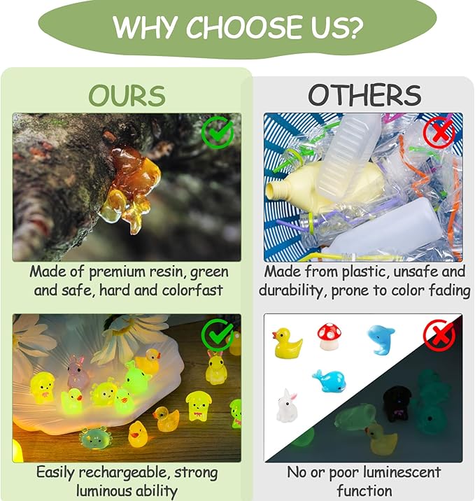 - Outstanding Glow-in-the-Dark Performance: Our mini resin ducks and animals absorb light easily and emit a charming glow at night. They glow after being exposed to sunlight, indoor light, or flashlight for about 20 seconds. Using a UV light can make their glow brighter and longer-lasting. Perfect for comforting children at bedtime and stimulating their imagination.