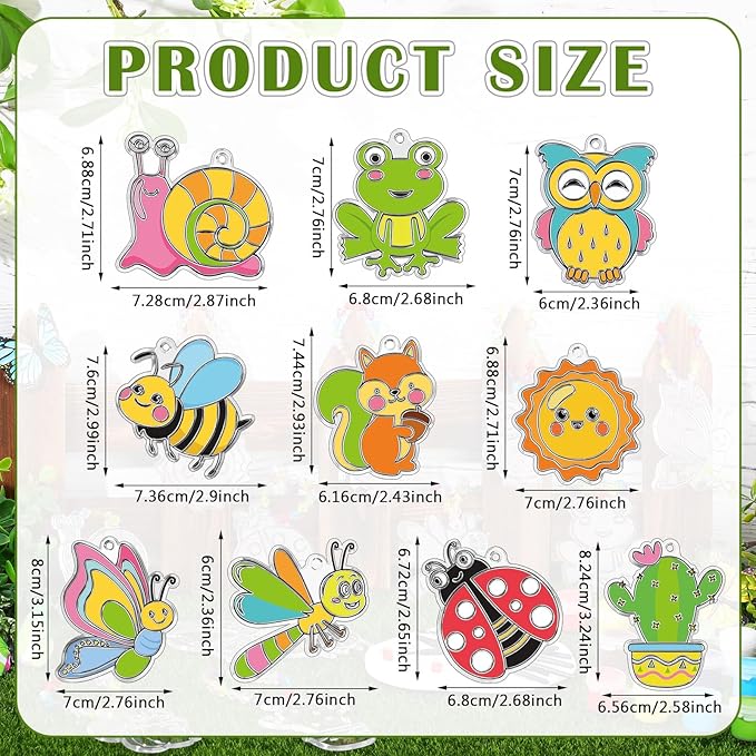 - Package Includes: you will receive 30 spring suncatchers window art kits include 30 sun catchers, 10 styles are butterfly, frog, honeybee, sun, cactus and so on, 3 of each style, 300 acrylic beads, 1 Roll 590.55 inches of fishing line, 30 paintbrushes (with enough paint), 30 suction hooks; Each set comes with a variety of designs and vibrant colors, mix and match to create special suncatchers for windows