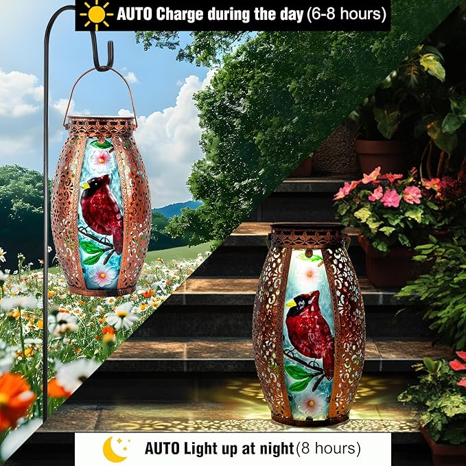 - 【Unique Glass Solar Lantern 】Hanging solar lantern feature a exquisite cardinal pattern, the vintage appearance will be unique addition for your garden or tabletop,and creating warm illuminated charm.