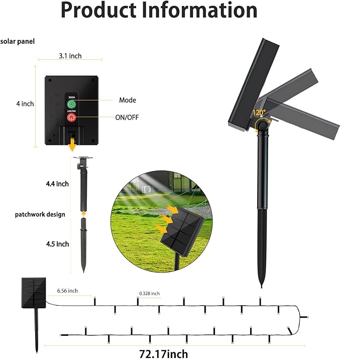 - Easy to Install: solar panel with ground stake, 72 feet long string lights are perfect for wrapping around a tree or anywhere you like to light up your garden, patio, lawn, porch, gate, yard, Halloween party, haunted house, Halloween decorations and more. The wire (lead) between the first LED light and the solar panel is about 6 feet long, so you can put the panel in the right place!