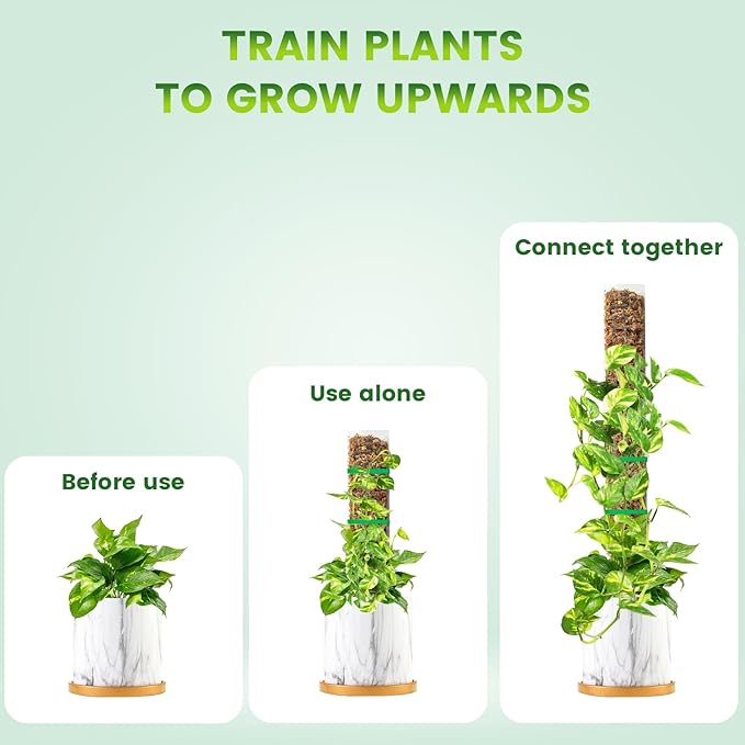 - [Simple Method of Use] First, Place the moss pole at the bottom of an empty pot. Place the climbing plant in next and tie it against the plant support stake. And finally, fill in with your potting mix! Next, cut garden ties to secure your plant's stems to the moss stick. Besides, it only takes you a few minutes to assemble our moss pole following instructions or video..