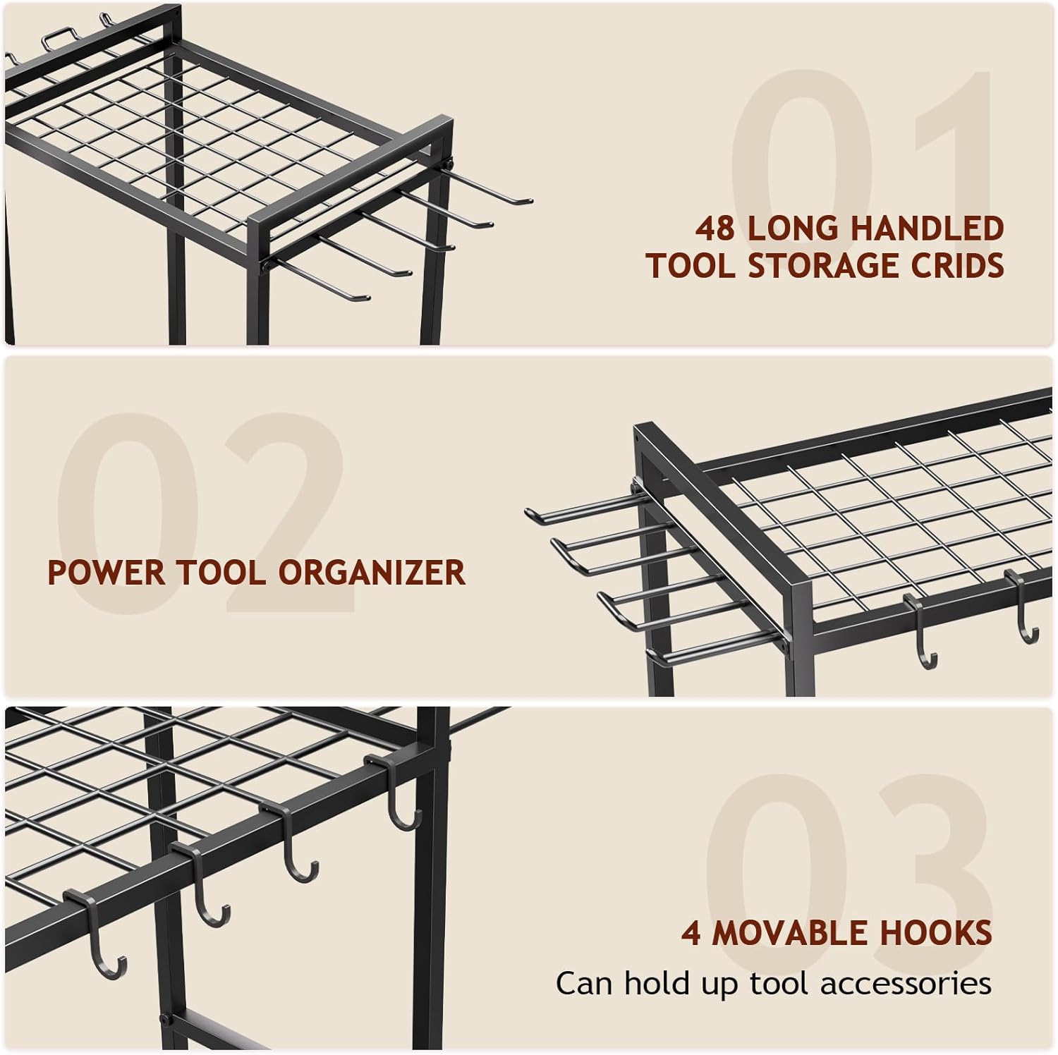 Garden Garage Tool Organizer - Yard Tool Organizer for Garage with 4 Hooks, Heavy duty Steel Garden Tool Rack Holds up to 48 Long Handled Yard tools for Storage