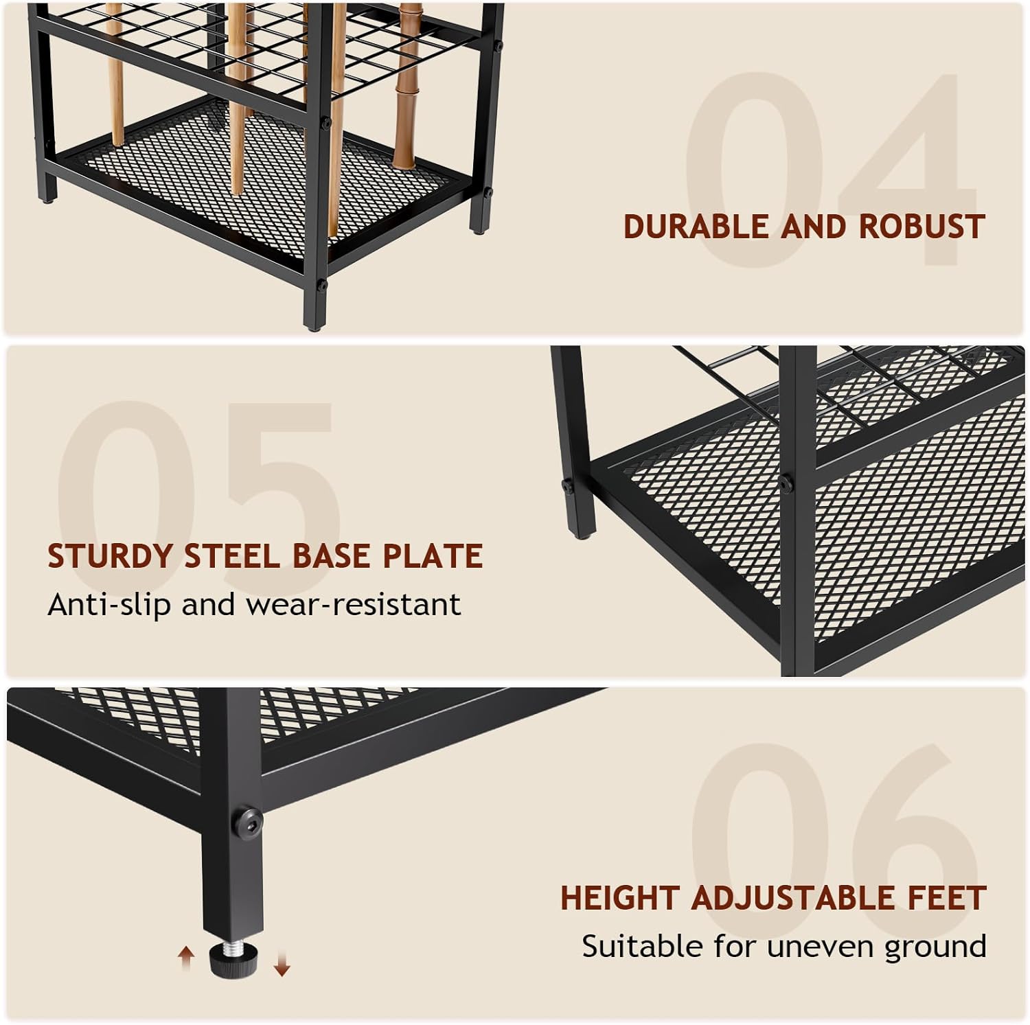 - 【Keep it tight, no more falling】: Paralleled up-down slots help keep sticks straight, ensuring most of your garden equipment remains in one spot without falling over. The bottom flow-through grate prevents standing water.