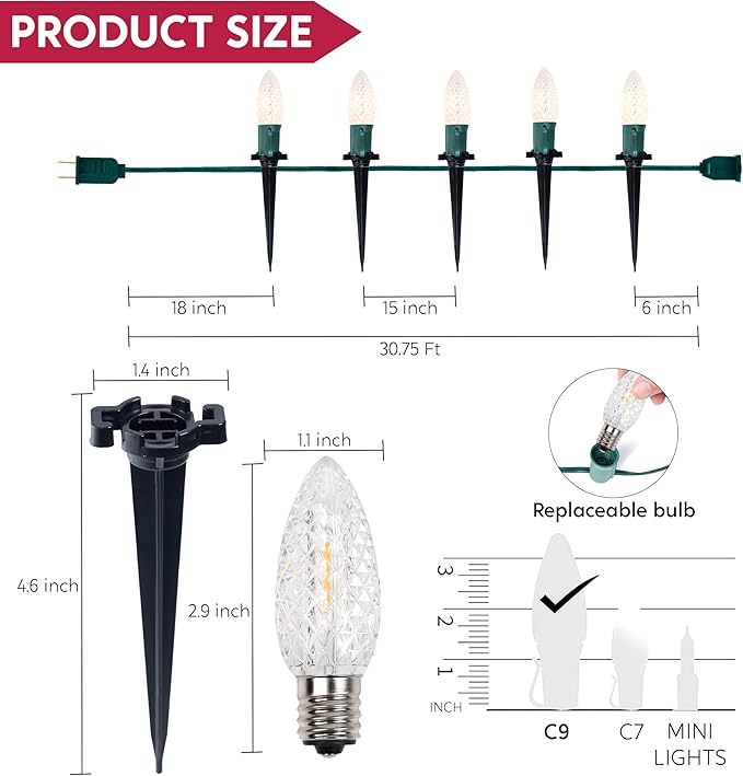 - Replaceable, Hangable, Pluggable: Provide 2 spare bulbs to install and replace, a light bulb broken does not affect other lighting bulbs. C9 LED Xmas jumbo bulbs stake lights for indoor and outdoor use for hanging and plugging; Green premium connected cable which could be hung and wrapped around any place to bright your way.