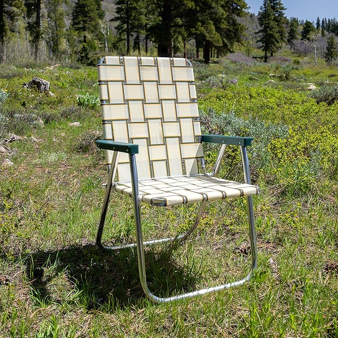 Lawn Chair USA Folding Aluminum Outdoor Patio Lawn Chair | Heavy-Duty Webbed Chairs for Camping, Sports, Beach, Yard & Tailgating | Lightweight Portable | Classic - Charleston Tan with Green Arms