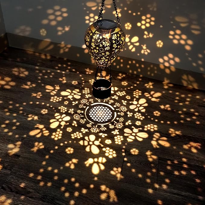 - 【Bee Pattern】The Profinella hot air balloon solar lantern features a unique metal bee cut-out pattern design. During the day, it serves as an art ornament to enhance your garden, yard or outdoor space; at night, it transforms into a magical light show, projecting clear bee patterns onto the ground or walls, adding endless charm to your outdoor decor.