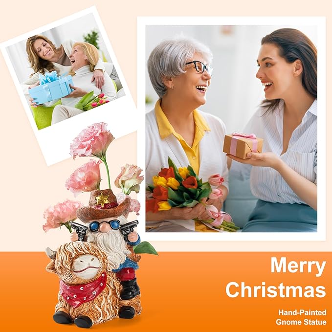 Garden Gnome Statue on Highland Cow with Solar Lights – Funny Outdoor Resin Decor for Patio, Lawn, Yard – Unique Gift for Women, Grandma, Mother's Day, Birthday, Housewarming