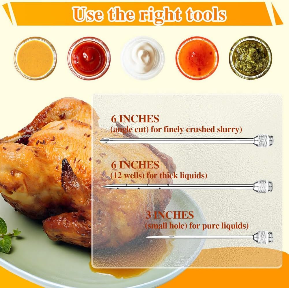 - Versatile Needle Options: This injector includes three specialized needles to suit all your seasoning needs: Side Hole Needle: Perfect for liquid marinades, allowing even distribution and deep penetration. Large End Hole Needle: Ideal for injecting minced garlic, onions, and other chunky ingredients. Short Needle: Designed for injecting smaller cuts like chicken, ensuring maximum flavor infusion.