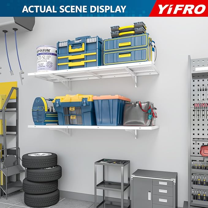 - HEAVY DUTY CONSTRUCTION: YIFRO garage wall shelving takes its cues from architectural frame construction, with a 1.5x4 ft individual bracket load capacity of 250 lbs. and a total of 1000 lbs. for 4 shelves, which makes it easy to store most of the items in your garage.