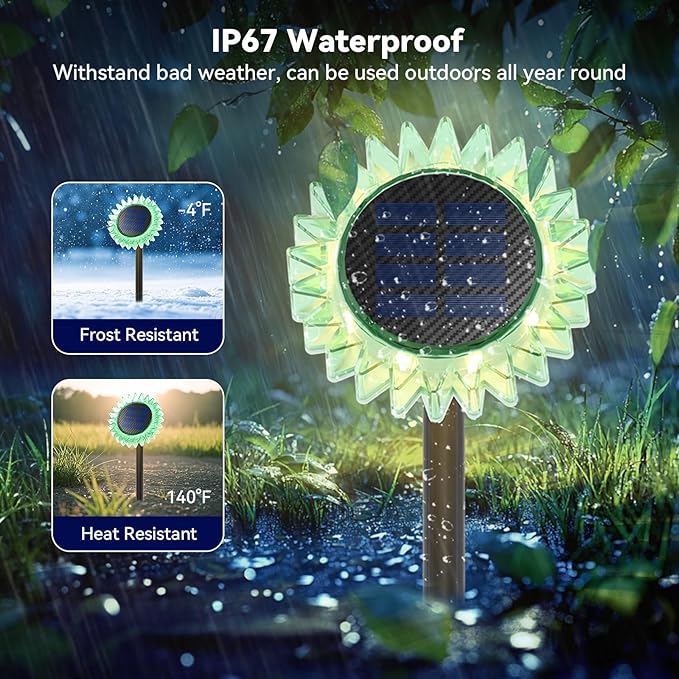 - Efficient Solar Charging & Long-Lasting Light: Sunflowers solar lights outdoor Features a larger, high-conversion solar panel and a 1000mAh rechargeable battery, charging in just 4-6 hours to provide 8-10 hours of beautiful illumination. Enjoy all-night lighting with no extra effort