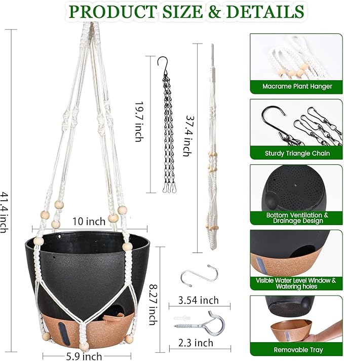 - 【Self-Watering Hanging Planter with Removable Tray】The Fielda hanging planter includes a detachable bottom tray that serves as a reservoir, holding a large amount of water while keeping it separate from the potting soil. When your plant needs water, it flows from the reservoir to the soil through absorbent cotton wicks, reducing the frequency of watering needed.