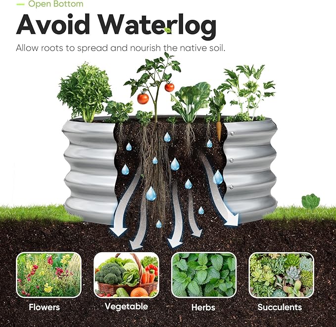 - 【Rolled Edge Design, Open Bottom】The rolled edges of the iron sheets prevent cuts during installation or planting, making it safe to use around pets and children. The open base design prevents water accumulation and rot, allowing roots to breathe better and providing a healthy environment for plant roots.