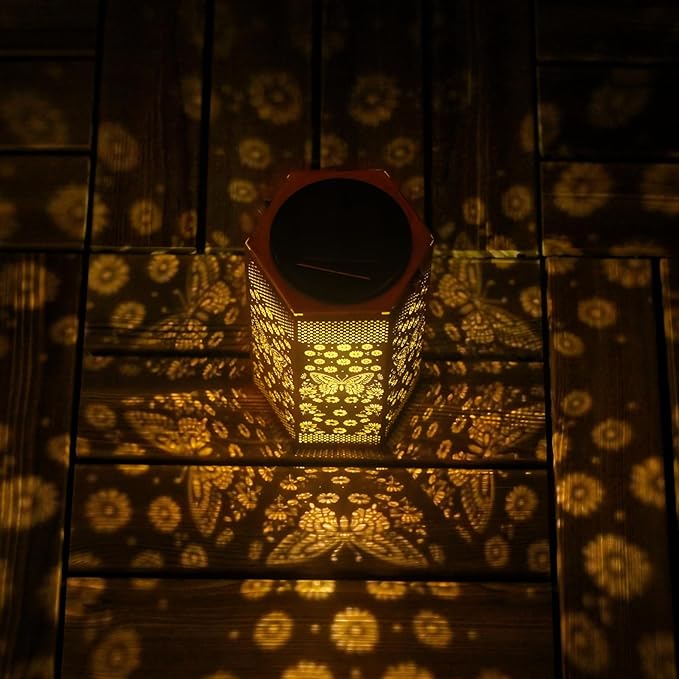 - Butterfly Garden Decor - Opjoy Outdoor Butterfly Solar Lanterns are crafted from upgraded durable metal, The retro appearance, with gold copper color and hollow out metal veneer, gorgeous color, casts bright and warm light in darkness, accompanied by gorgeous and graceful patterns, adding a beautiful atmosphere to the surrounding environment. Add illuminated charm to a garden, patio, porch and outdoor tabletop with these solar lights. Make your outdoor spaces unique and amazing