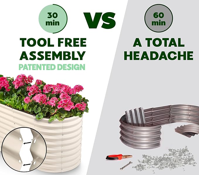 - EFFORTLESS ASSEMBLY, LIKE NO OTHER! Begin your planting journey by choosing our innovative patented design, featuring the perfect combination of easy assembly and durability. Thanks to our unique tool-free design, assembly is a breeze and can be completed in just 30 minutes! Get started on your garden right away and enjoy fresh, healthy produce in no time.