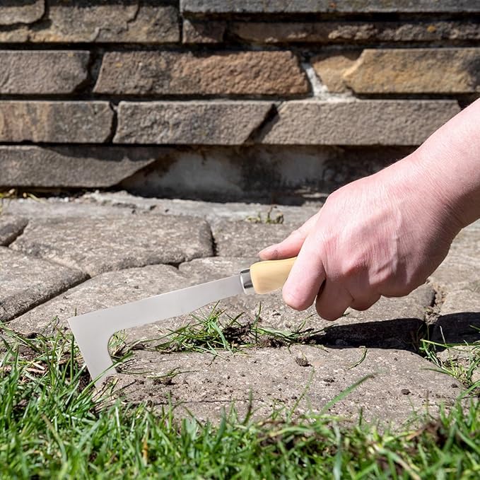 - Hand Crack Weeder: the L-shaped blade is ideal for removing stubborn moss and weeds between paving stones; The sharp cutting part of the tool can easily remove weeds and moss from stones, and it helps trim the edges of lawns very effectively