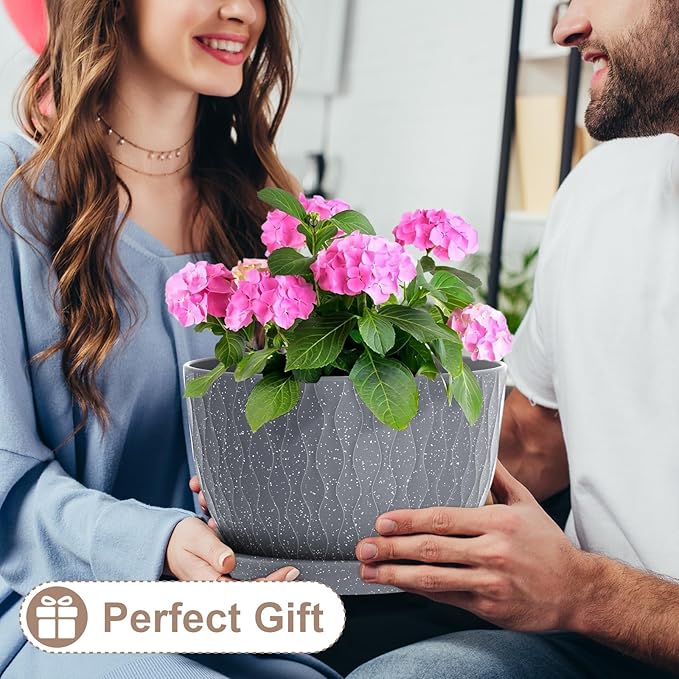 12 Inch Wide Water Ripples Flower Pots for Indoor or Outdoor Plants, Large Plant Pots with Drainage Holes & Saucer, Plastic Planters Set for Garden & Home Decor (Grey with White Speckles)