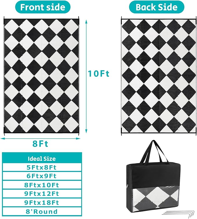 • Versatile Outdoor Carpet: The indoor outdoor plastic rugs have multiple choice in different colors(4'x6',5'x8',6'x9',8'x10',9'x12',9'x18',8'round), is ideal for a variety of indoor outdoor activities,like patio mat, deck rug, garden rug, beach mat, picnic mat, BBQ party mat, rv camping rug,pool rug,outdoor doormat,garage rug,front door mat,allowing you to have plenty of imaginable space for more fun.