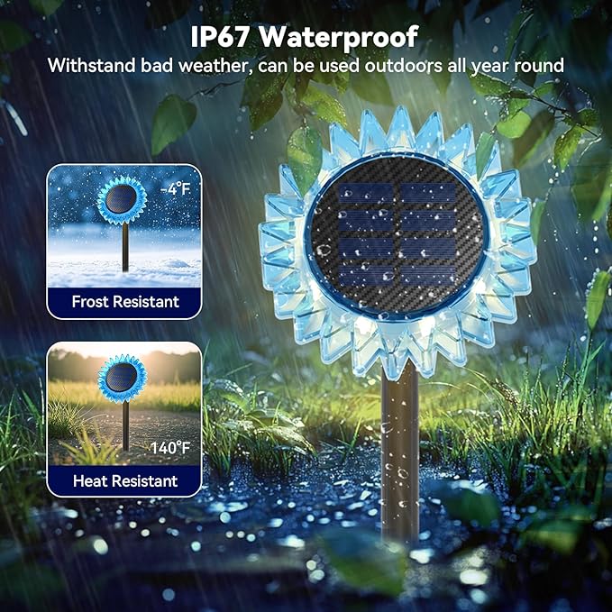 - -4Β°F to 140Β°F All-Weather Durability: Solar lights outdoor has passed four rounds of strict quality inspection before leaving the factory. Solar yard lights made of high-strength ABS & PC materials, IP67 waterproof, heat-resistant, frostproof, dustproof, no need to worry about rain, snow and harsh sun affecting the performance of fixtures as outdoor decorations, providing reliable lighting in all seasons