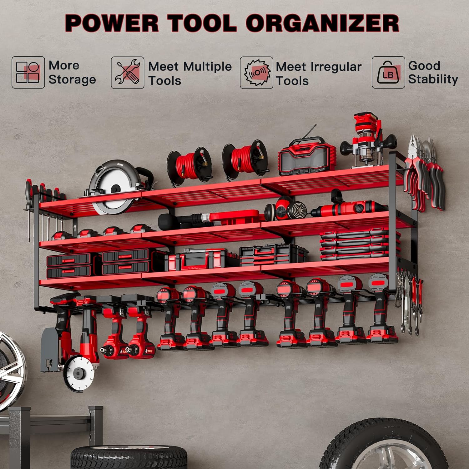48" Large Power Tools Organizer Wall Mount,12 Drill Holder for Garage, Workshop Heavy Duty Storage Rack (Red)