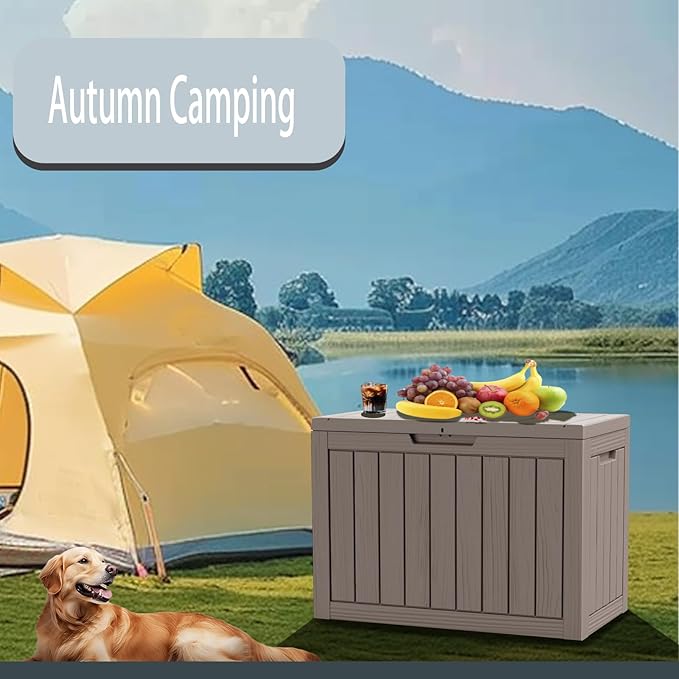 - Our deck box offers an impressive storage capacity, perfect for organizing patio cushions, pool accessories, gardening tools and more. This multipurpose storage solution not only helps keep your outdoor space tidy but also functions as a bench or table. Whether in your backyard or on the patio, this deck box is designed to meet your every need.