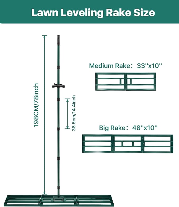 - Everything You Need to Get Started: Turf rake kit includes all the hardware needed. Easy to assemble. So you can start leveling your lawn immediately. Whether you're a professional landscaper or a DIY enthusiast, our Lawn Leveling Rake is the ideal tool for achieving a perfectly manicured lawn and garden