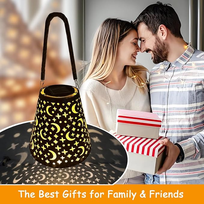 - 【Elegant Decorative Design】The retro appearance, with a gold copper color and hollow-out metal veneer, the solar lanterns outdoor casts a bright and warm light with graceful and gorgeous Star Moon pattern at darkness.When the light is projected on the table or ground to create a lifelike beautiful pattern, making your garden stand out