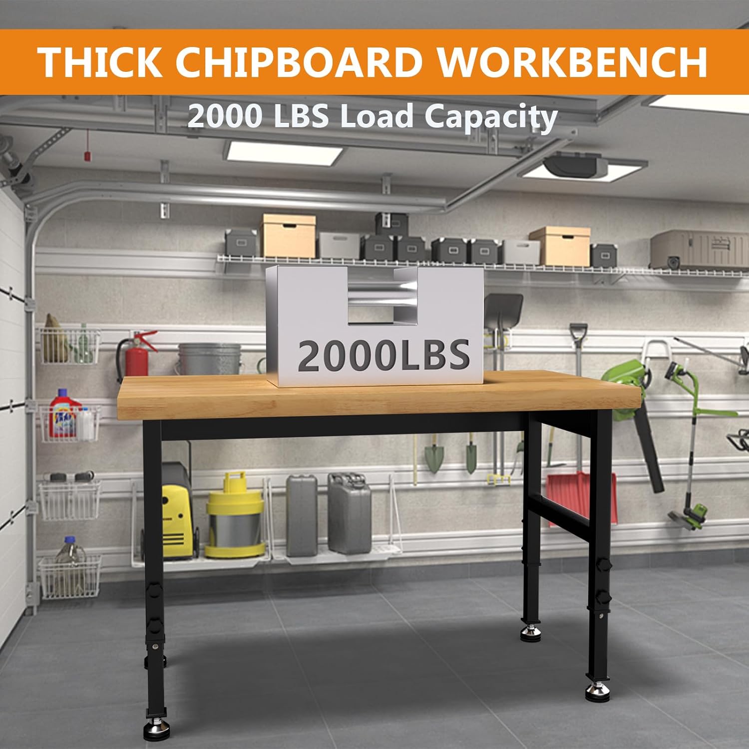 48" Work Bench, Adjustable Height Workbench with Rubber Pad, Heavy-Duty Work Table with Power Outlets, 2000 LBS Capacity Workstation for Garage, Workshop, Office, Home