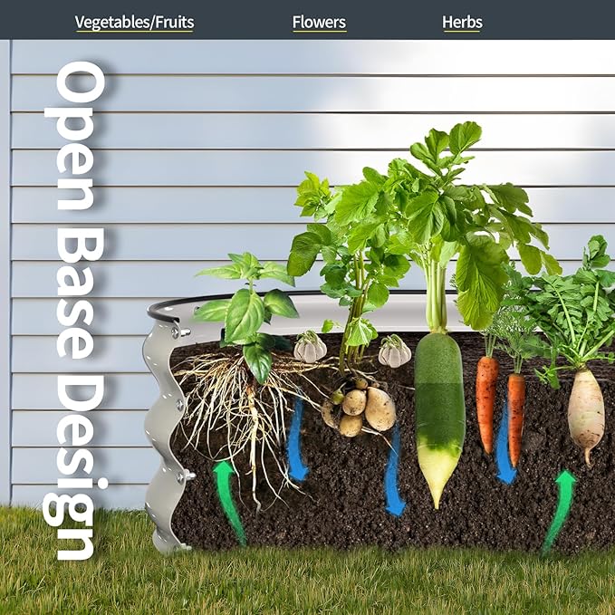 - Open Bottom Design: Open base provides good drainage and effectively protects the roots from rotting due to excessive watering. Metal garden bed is perfect for growing fresh vegetables, fruits, and flowers in your garden or greenhouse