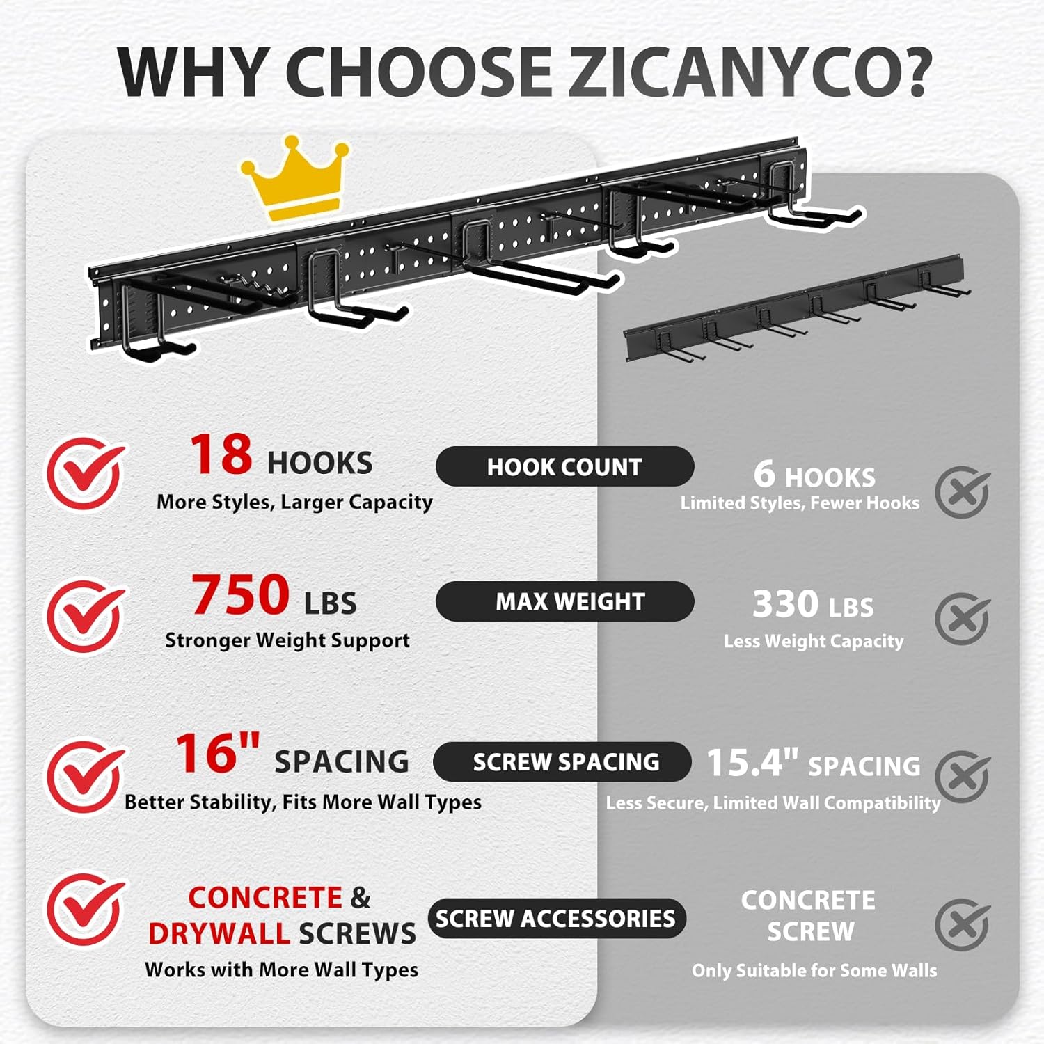 - Stable and Secure: This garage wall organizer with 16-inch screw spacing, it installs firmly into wall studs. We’ve also included screws for drywall mounting, offering added convenience