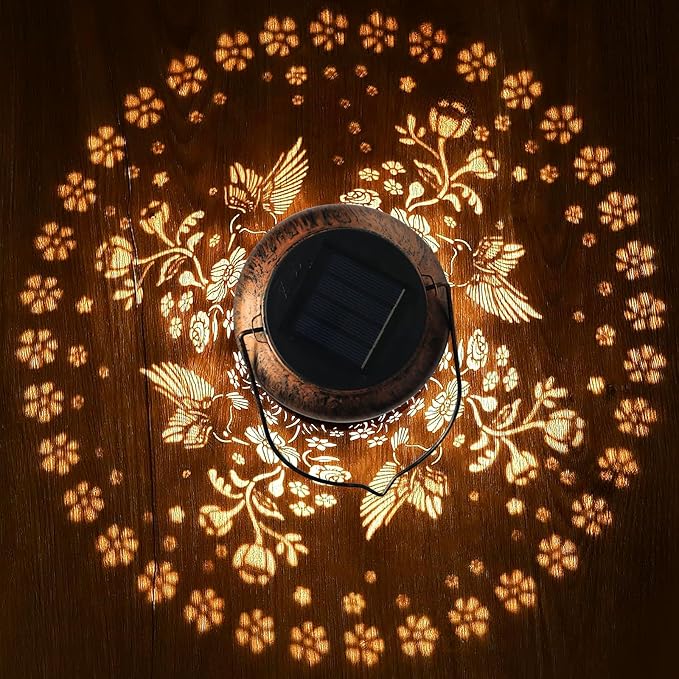 - Exquisite Decoration Design: The retro appearance, with gold copper color and hollow out metal veneer, the solar outdoor lanterns casts bright and warm light in darkness, accompanied by gorgeous and graceful Hummingbird patterns, adding a beautiful atmosphere to the surrounding environment.