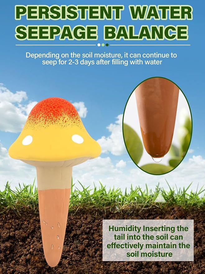 - 【Unique Shape】The plant watering globe is in the shape of a mushroom, made of terracotta, and comes in different colors, which look the most lively and decorative in plant pots. Equipped with 4 wooden stoppers to prevent moisture in the device from evaporating.