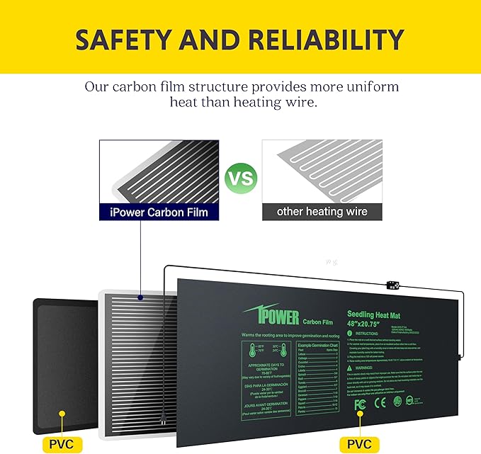 - Heating film structure: heating film ensure uniform heating. Warms root area 10-20℉(5-11℃) over the ambient air temperature, which will increase the success of seedlings and cuttings