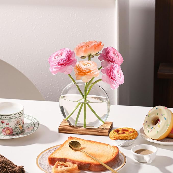 4 Pack Plant Propagation Station with Wooden Base Glass Terrariums for Indoor Plants Decorative Round Vases for Flowers Hydroponic Planter for Home Office Decor