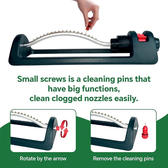 - Easily Clean - If the nozzles get clogged, the sprinkler built in nozzle cleaner at the end of the chassis to clear out clogged nozzle, easy to maintenance.