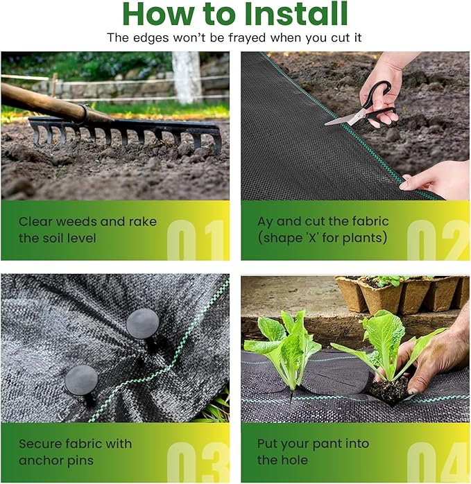 - High-Quality Garden Weed Barrier Fabric: Our garden weed barrier fabric is made of high-density, 3.5OZ woven professional-grade polypropylene, durable and not easy to tear. This weed control fabric is breathable and UV-resistant, ensuring long-lasting performance even in hot, dry climates. Garden fabric weed barrier allows air & water flow while blocking weeds, keeping soil moist and promotes plant growth, making your gardening life easier and more efficient
