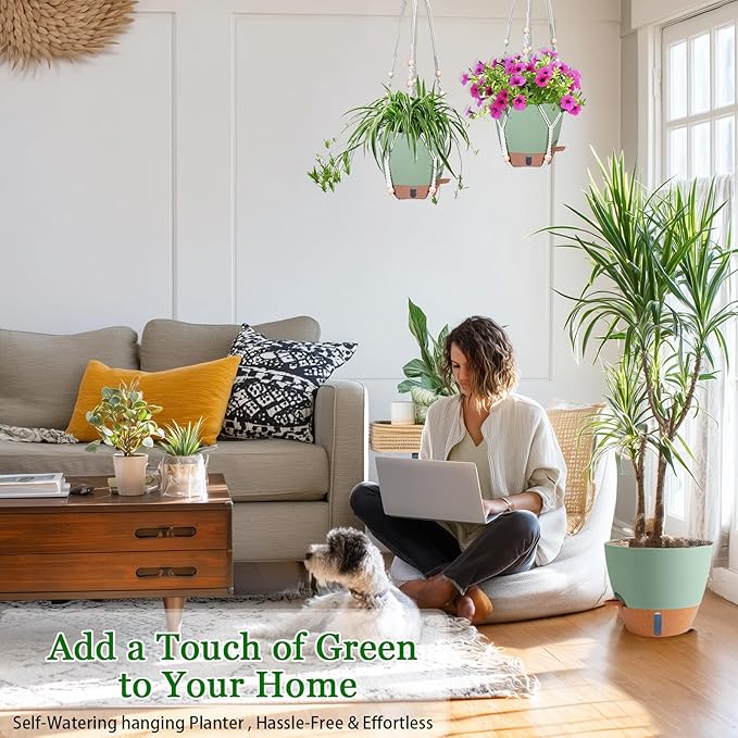 - 【Smart Self-Watering System】 Our hanging plant pots come with a REMOVABLE RESERVOIR TRAY that stores 7-10 day water supply. Absorbent cotton ropes automatically deliver moisture to soil when needed - ideal for vacations or busy lifestyles. Spend less time watering hanging baskets for indoor plants!