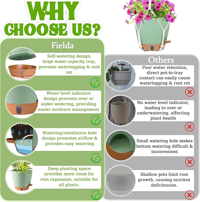 - 【Never Over/Underwater Again!】Fielda's indoor hanging planters feature an EXCLUSIVE WATER WINDOW in the base tray - instantly check moisture levels without guesswork! Protect your plants from dehydration and promote healthy root systems with this visual watering guide. Perfect for hanging pots for indoor plants enthusiasts who value scientific plant care.