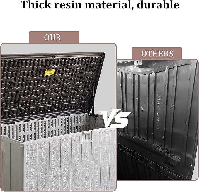 - All-Weather Durability Built to withstand any weather, our deck box is made from resin that offers waterproof, UV-resistant, and corrosion-resistant protection. No matter the seasonβbe it scorching sun or heavy rainβthis box will keep your items dry and its exterior looking as good as new.