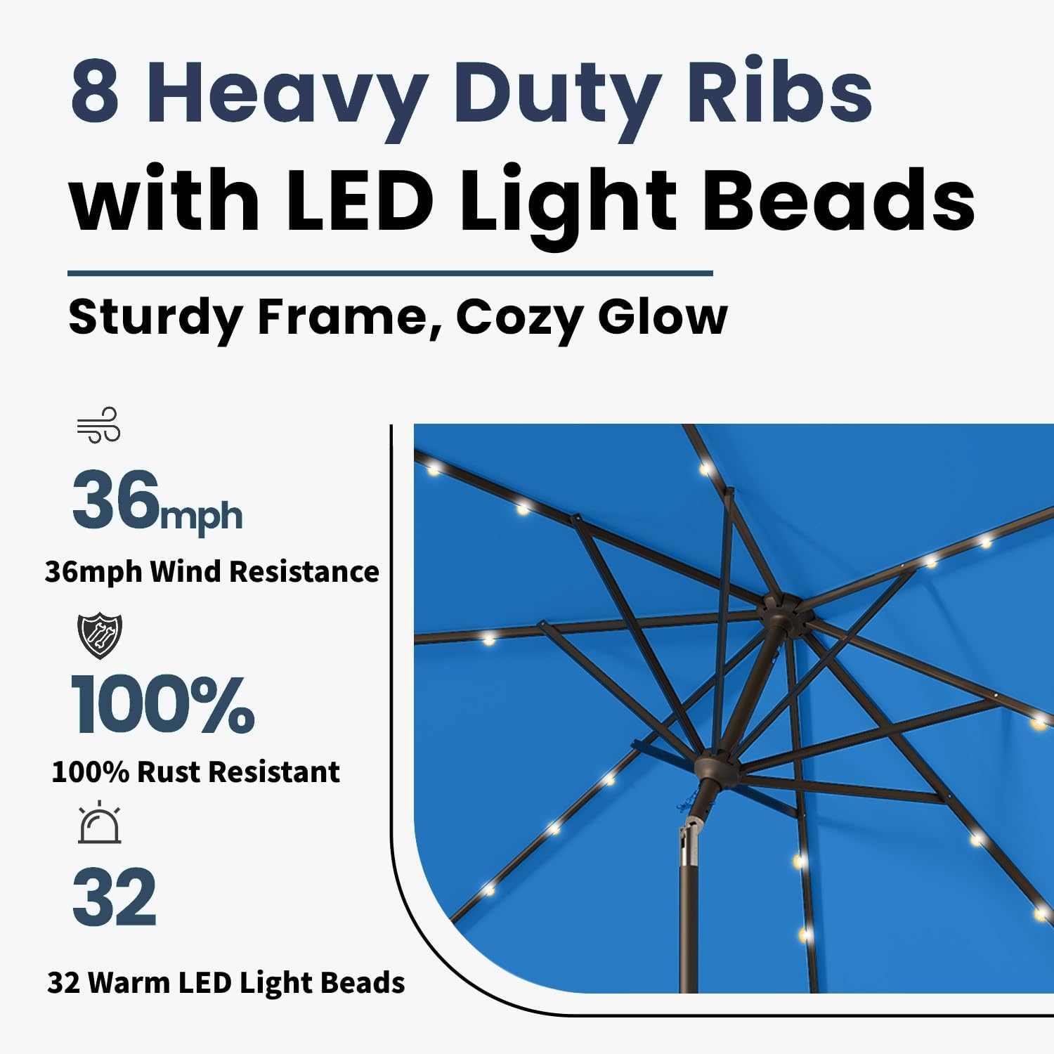 10FT Solar Umbrella 32 LED Lighted Patio Umbrella Table Market Umbrella w/Tilt and Crank, UV-Resistant Outdoor Umbrella for Pool, Garden, Deck, Royal Blue