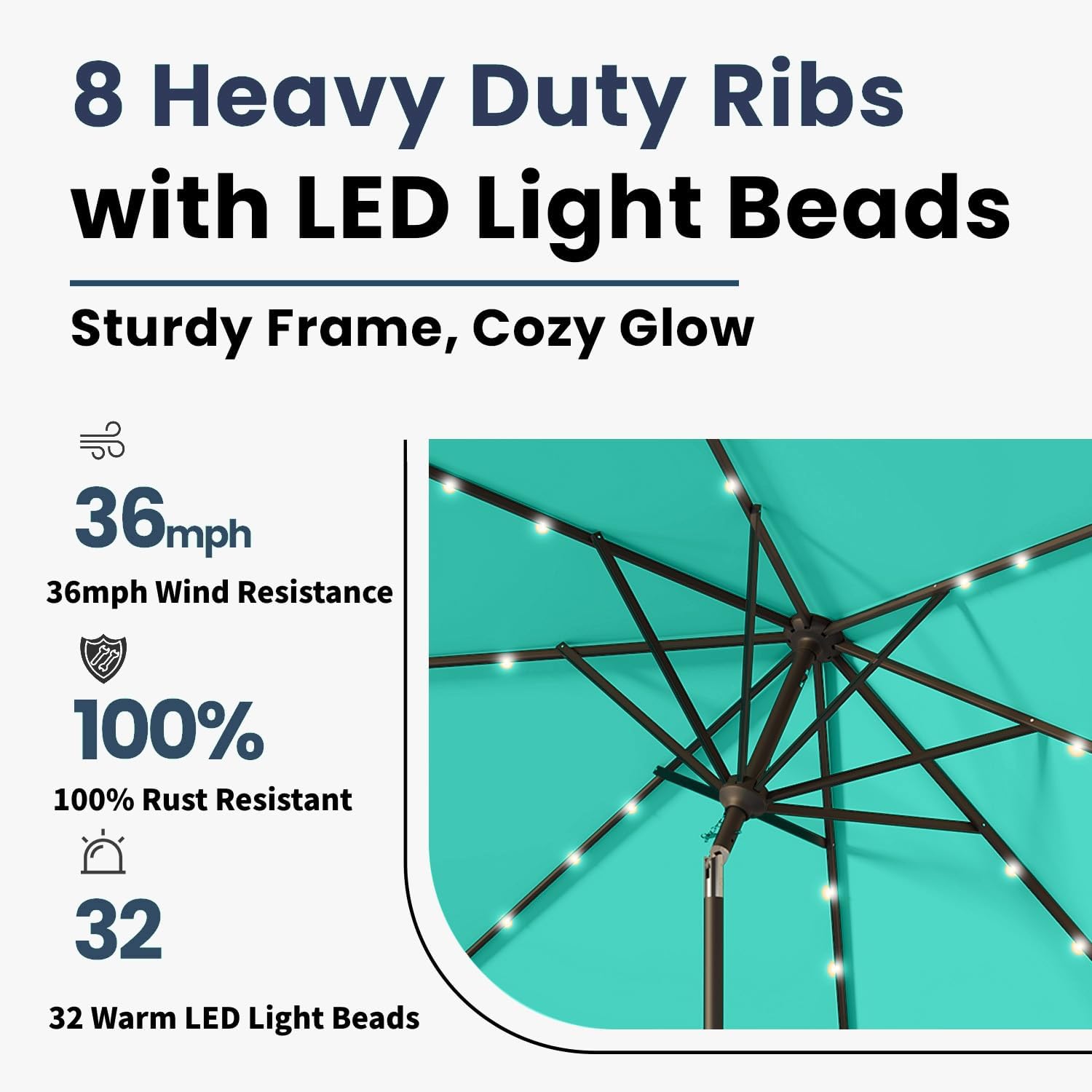 - 32 Solar-Powered LED Lights: Illuminate your evenings with 32 built-in LED lights powered by a high-efficiency solar panel, without the need for external power sources, providing up to 8 hours of ambient lighting.