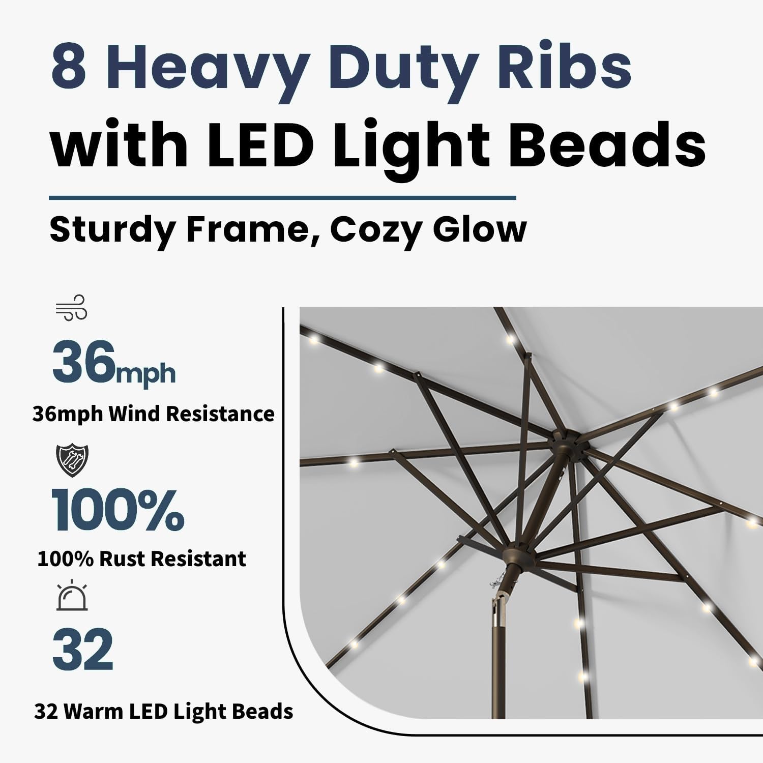 10FT Solar Umbrella 32 LED Lighted Patio Umbrella Table Market Umbrella w/Tilt and Crank, UV-Resistant Outdoor Umbrella for Pool, Garden, Deck, Light Gray