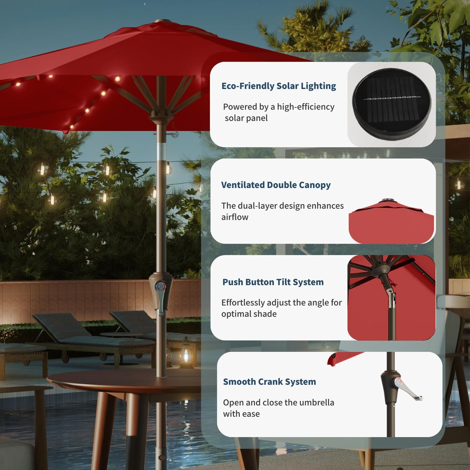 10FT Solar Umbrella 32 LED Lighted Patio Umbrella Table Market Umbrella w/Tilt and Crank, UV-Resistant Outdoor Umbrella for Pool, Garden, Deck, Red