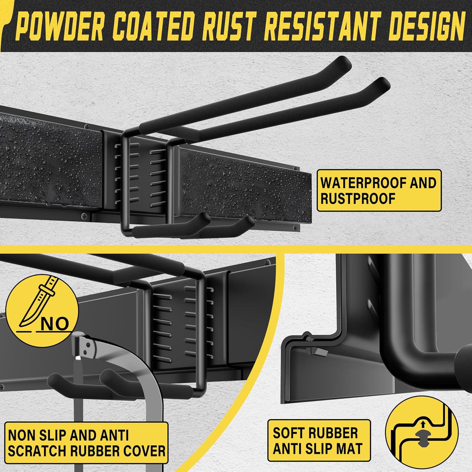 - IMPROVED DESIGN:Yard Tool Organizer for Garage.Double Upper Hooks:Wider Spacing to 2.48 inches.Double Lower Hooks:Wider Spacing to 2.52inches.Fulfills More Hanging Needs.Equipped With 12 Hooks(12 Double-Layer Hooks,3 Nylon Taping) and 6 Rails.