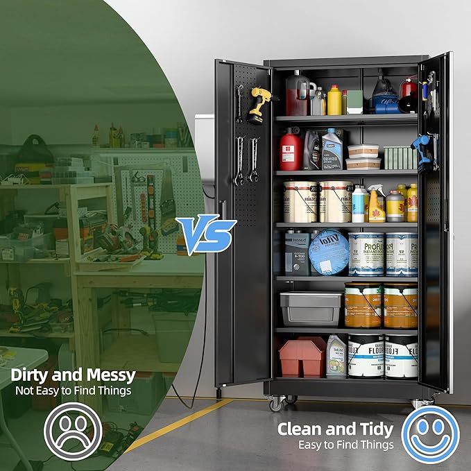 - Ample & Flexible Storage Solutions: Maximize organization with 5 adjustable shelves (customizable height) and pegboard on both doors, paired with 4 hooks for hanging tools, accessories, or gear. This design of the garage storage cabinet with wheels adapts to your needs, whether storing heavy-duty items or small essentials;