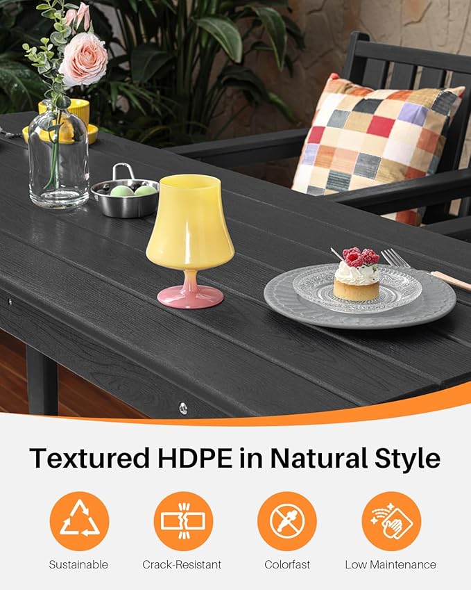 - Durable HDPE Bar Stool Set for Year-Round Use: This Obsidian 3-piece patio bar set includes two Adirondack-style HDPE bar stools and a matching 60"L x 22"W x 41"H rectangular outdoor bar table. Made from premium HDPE lumber with an authentic woodgrain finish, this set resists fading, cracking, and moisture damage—ideal for balconies, patios, pool decks, or outdoor bars throughout all seasons.