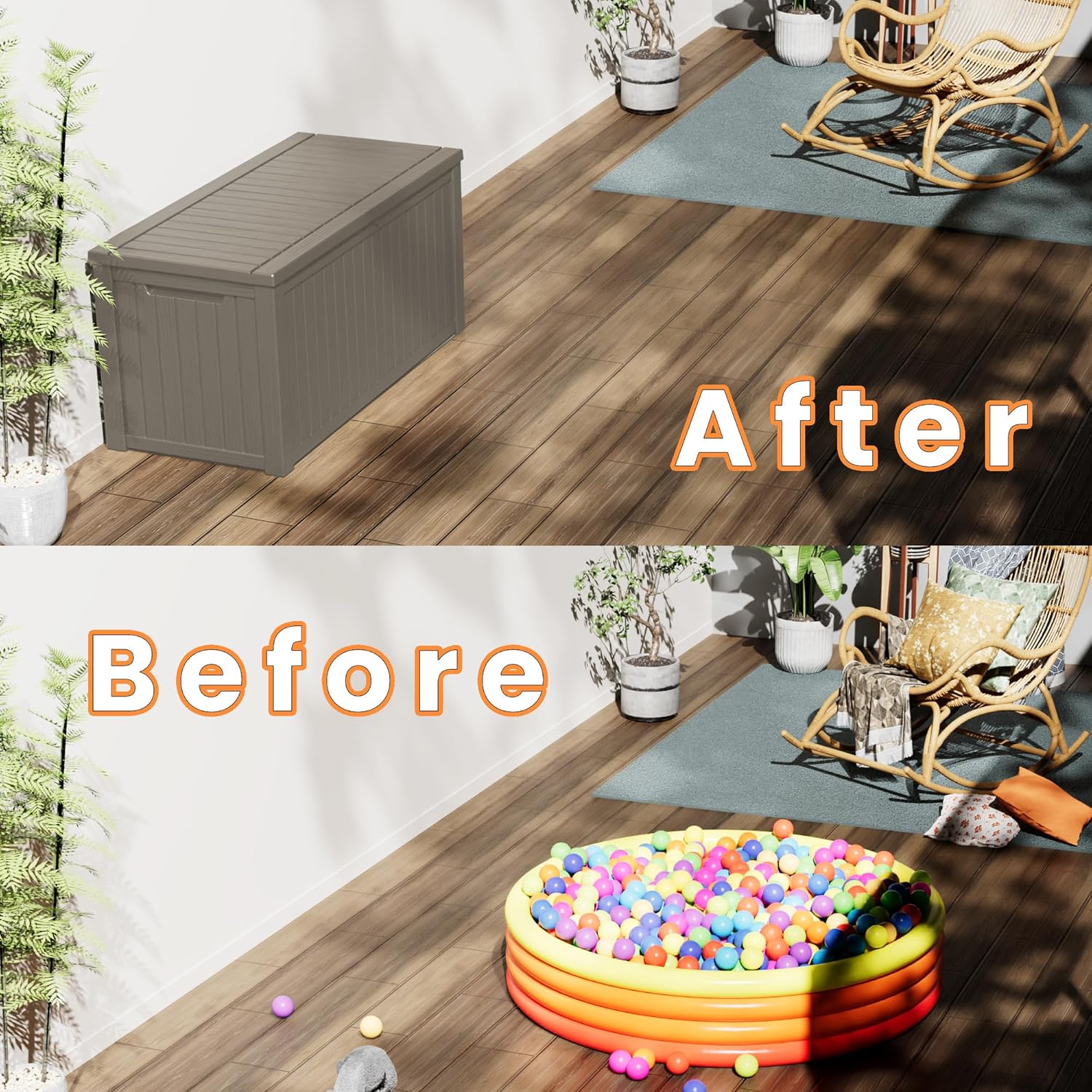 - 【Weatherproof Resin with Anti-Fade Technology】 Fade-proof resin with wood grain finish resists sun bleaching and rain damage. Sealed lid keeps contents dry—ideal for "weatherproof outdoor storage", "resin deck box", and "garden hose storage" needs.