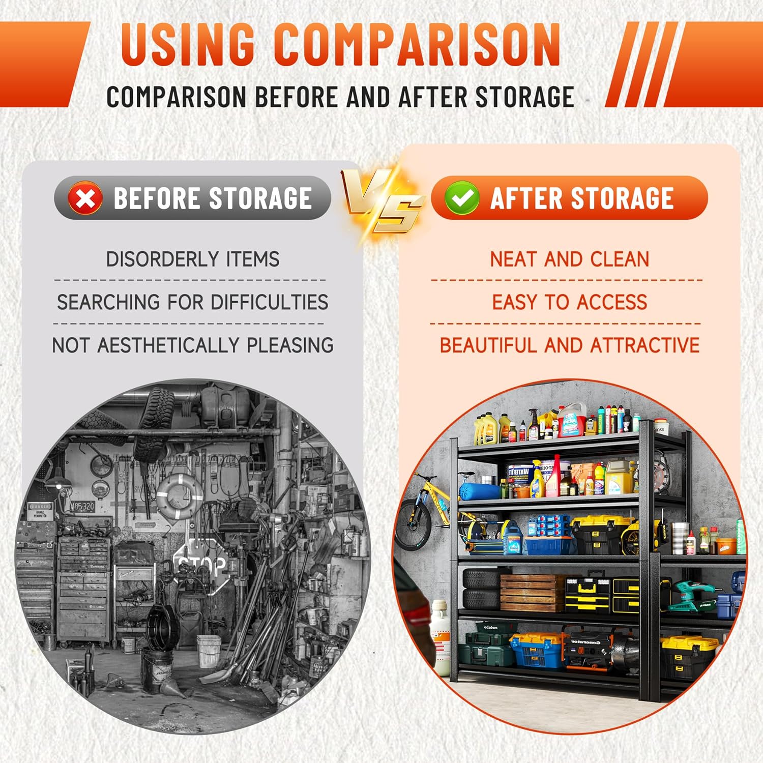 - 【Flexible Height Adjustment, Greatly Improve Space Utilization】This garage shelf can freely raise and lower the height of the five tiers of boards through the design of micro-adjustable slots, which can accurately match the different sizes of items from toolboxes and paint buckets to engines, containers and other items, and improves the utilization rate of each tier! The garage shelves are designed with tool-less adjustments, locking with the push of a finger, no need to remove bolts, and switching can be done in less than 30 seconds.