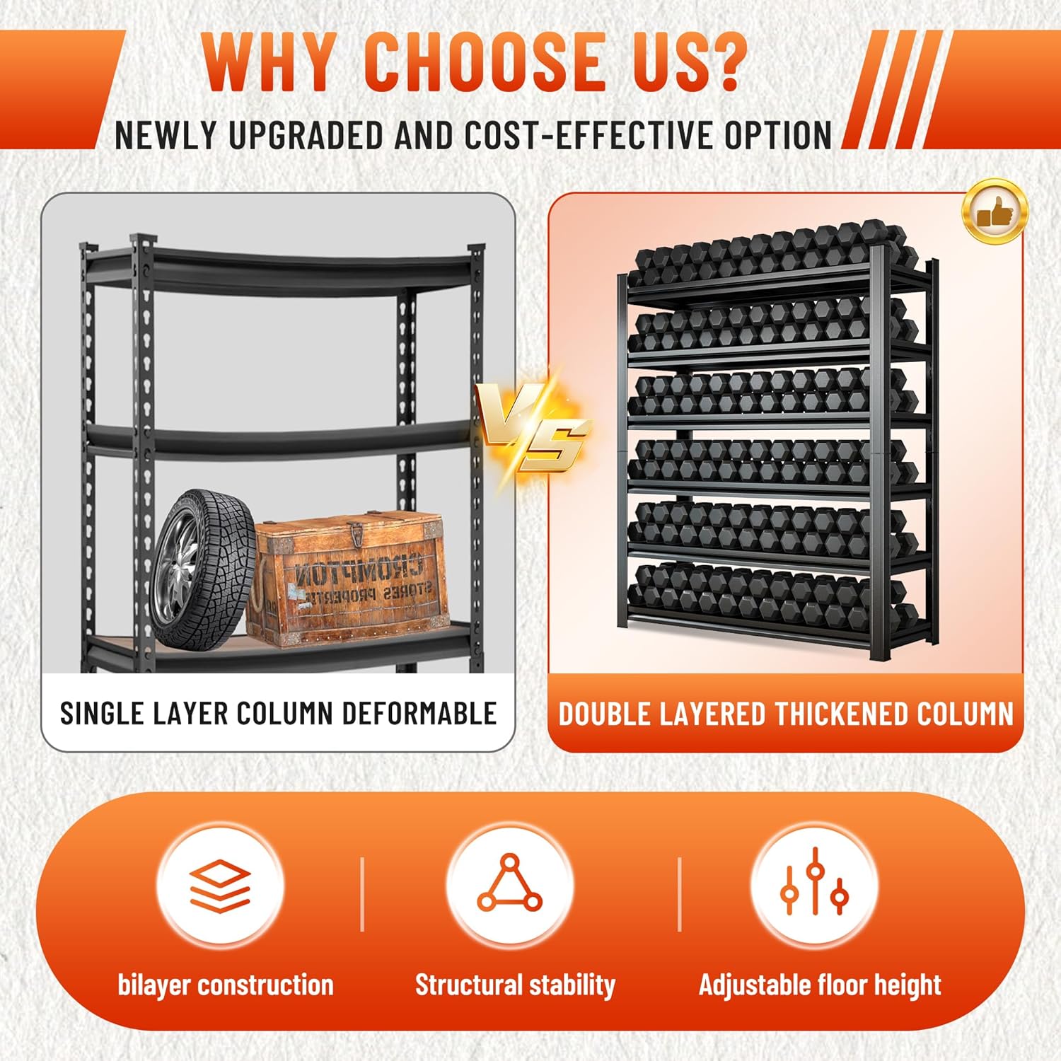 - 【High-Quality Steel with Anti-Rust Coating】Constructed with a thick, heavy-duty metal steel frame featuring a rust-proof black coating for superior corrosion and wear resistance. Ideal for humid environments (like basements and warehouses), this shelving unit maintains its structural integrity without warping or deformation over time.