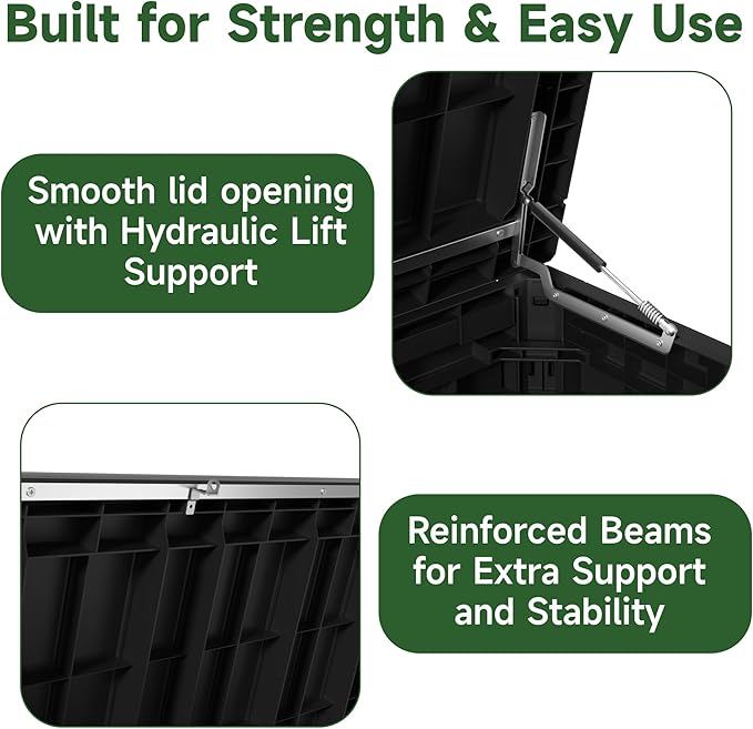 - ROBUST & STABLE DESIGN - Reinforced with metal rods and internal supports, this deck box can hold up to 880 lbs, providing exceptional durability. Its thicker panels and precise assembly ensure greater stability and help prevent deformation over time.